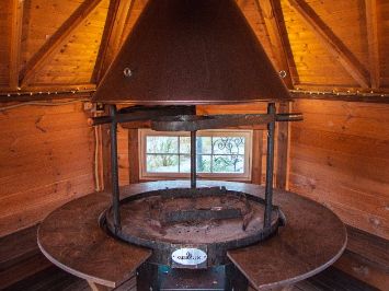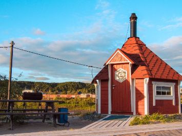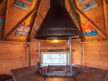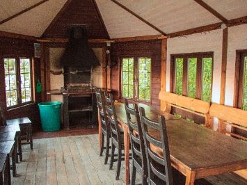 Внутри — стол и скамейки, подключено электричество, рядом — мангал для приготовления блюд на углях.