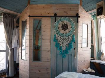 Внутри — кровать, душ, чайная зона и всё для отдыха